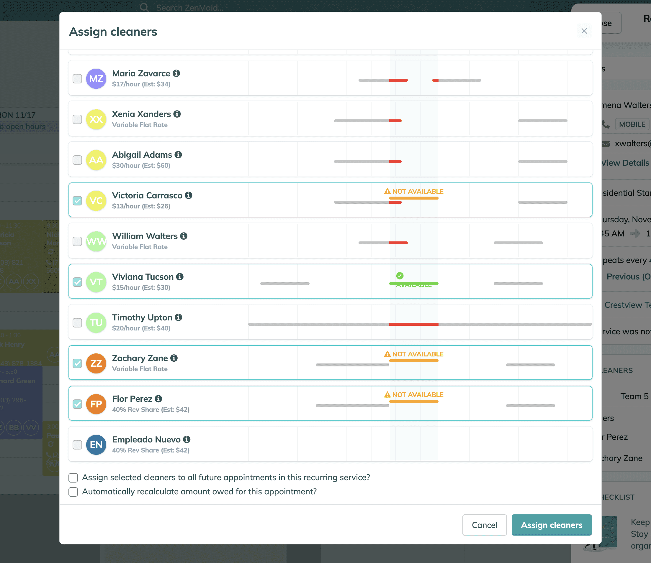 ZenMaid cross-checks cleaner availability as you assign appointments, so you never accidentally overlap jobs.