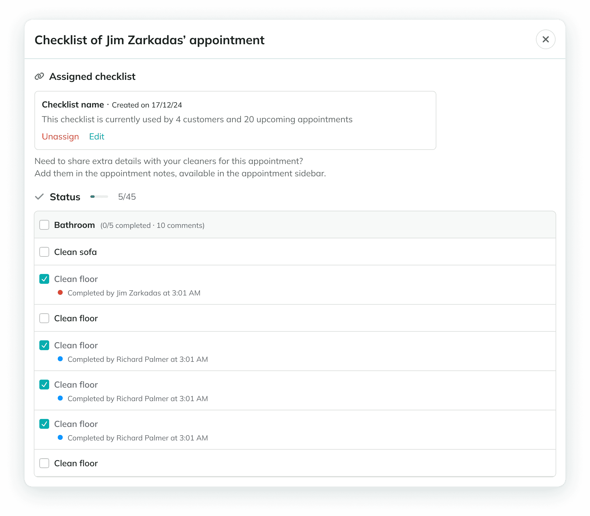 Cree listas de verificación de negocios de limpieza diferentes para cada tipo de servicio o necesidades individuales del cliente. Su equipo siempre sabe qué solicitudes especiales debe recordar.