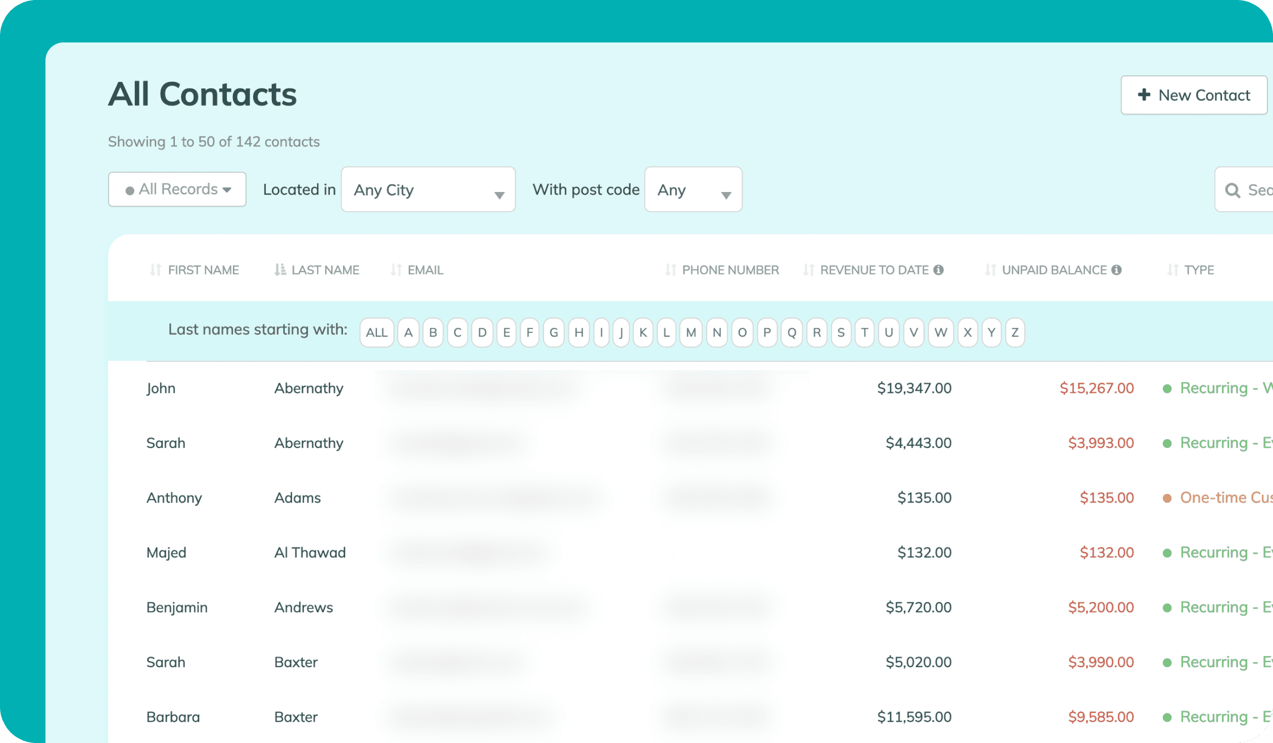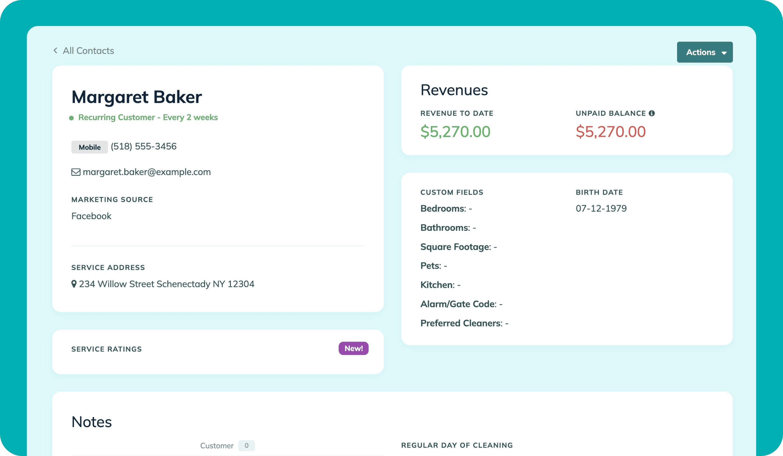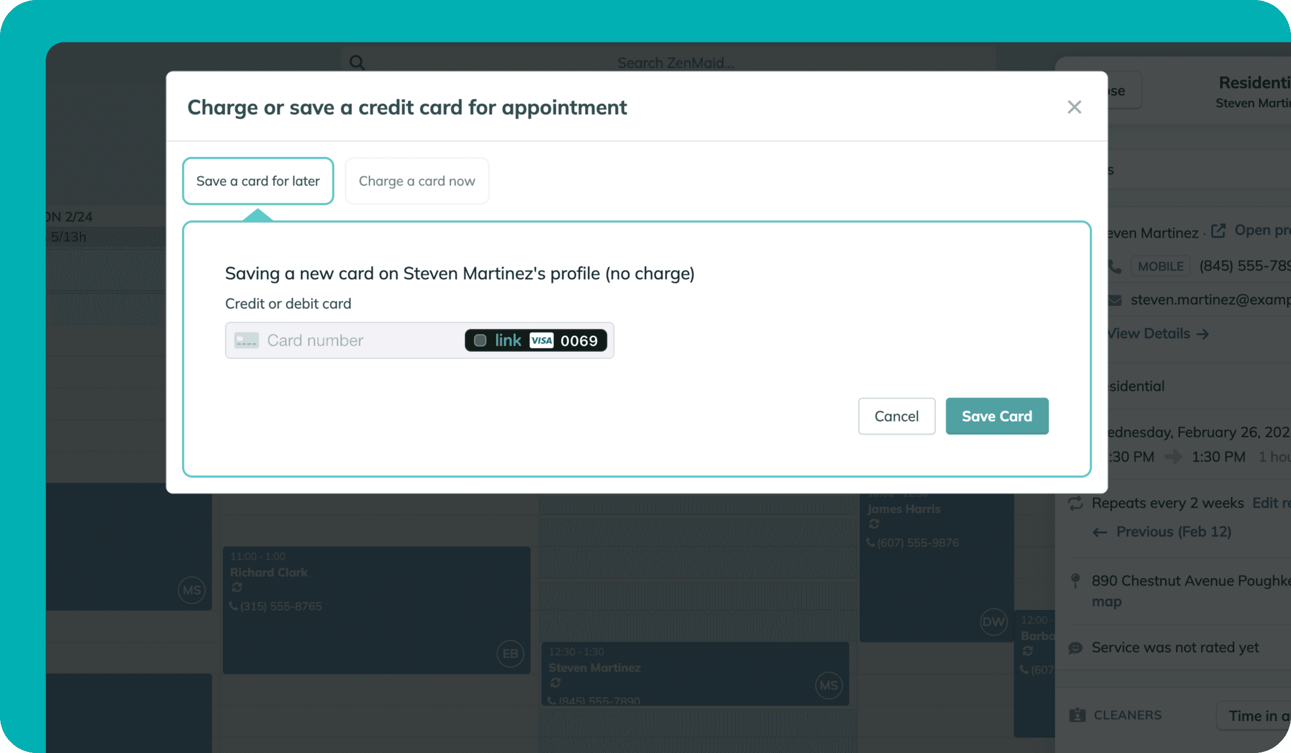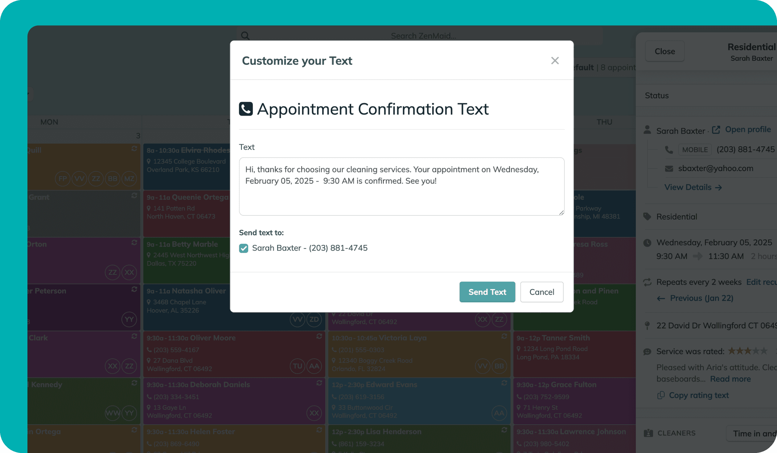 No más buscar entre notas o desplazarse interminablemente para encontrar un cliente. La página de contactos de ZenMaid mantiene a todos tus clientes en un lugar fácilmente accesible para búsquedas.